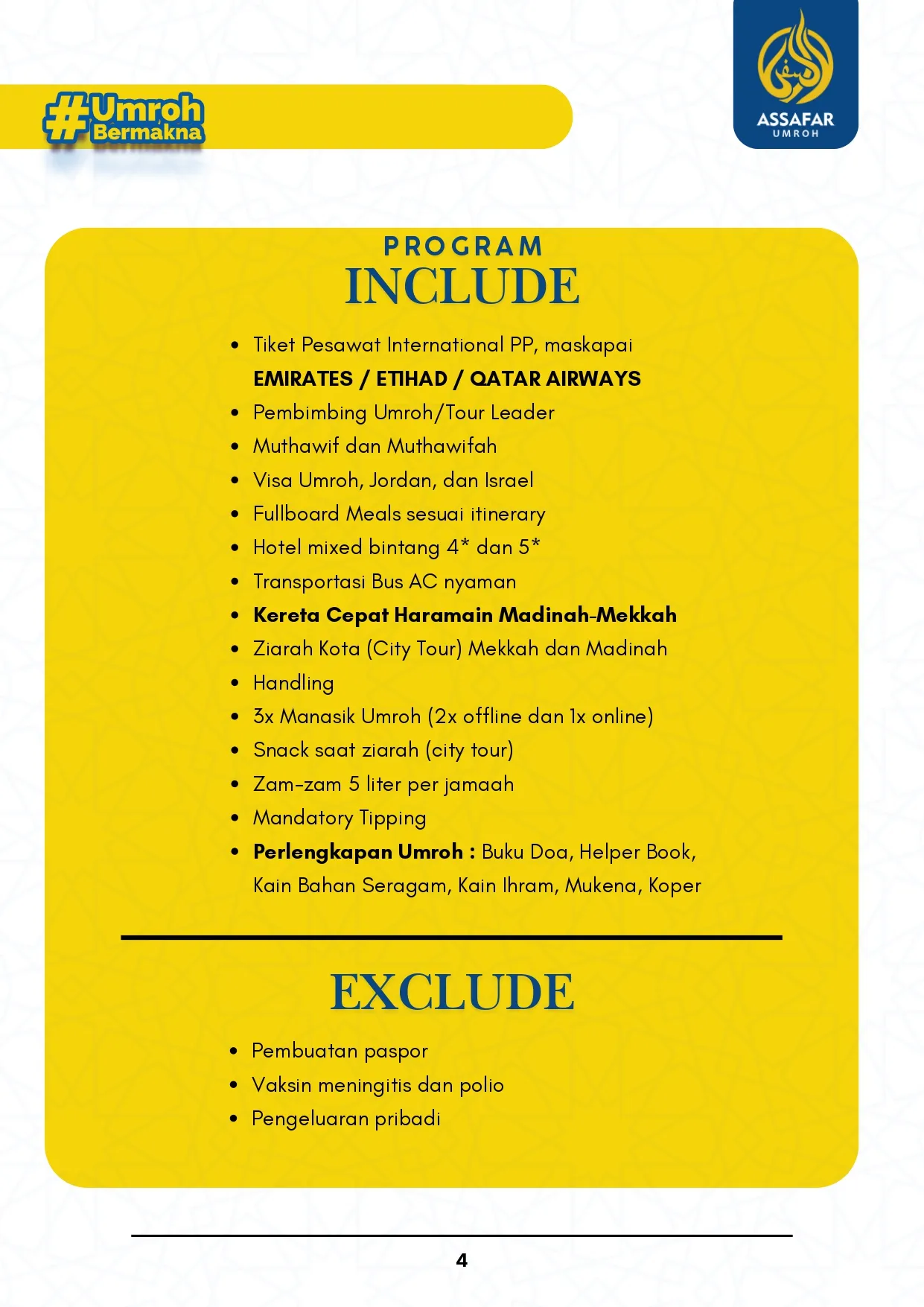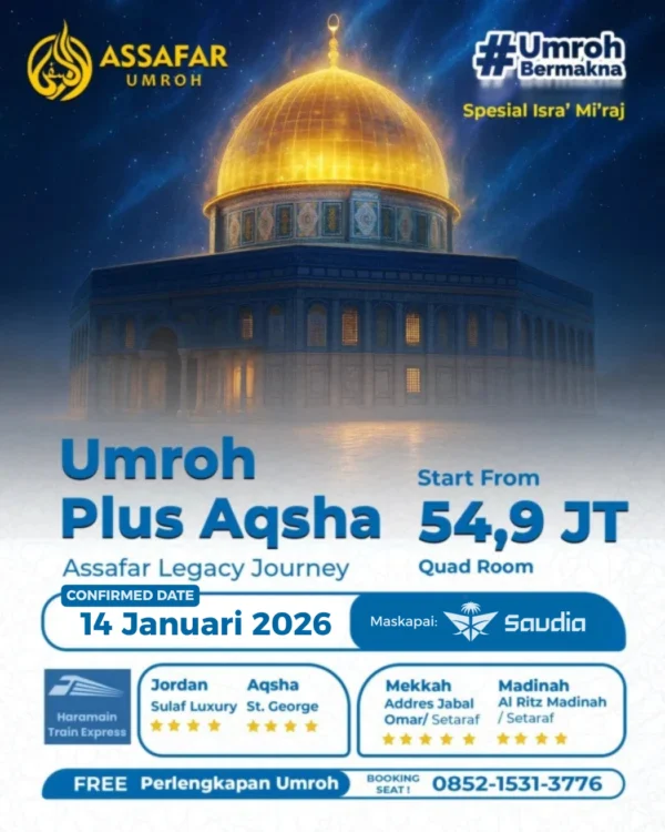 Jelajahi dua Tanah Suci dalam satu perjalanan spiritual yang tak terlupakan! Paket Assafar Legacy Journeys menggabungkan ibadah Umroh di Madinah & Mekkah dengan napak tilas sejarah di Masjidil Aqsha, Yerusalem.