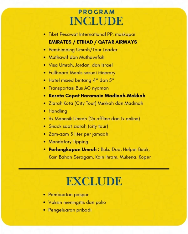 Nikmati 15 hari penuh berkah, mengunjungi situs-situs bersejarah di Yordania dan Palestina, lalu sempurnakan ibadah Anda di Masjidil Haram dan Masjid Nabawi. Dengan fasilitas lengkap, akomodasi premium, dan bimbingan Ustadz profesional, perjalanan Anda dijamin aman dan nyaman.